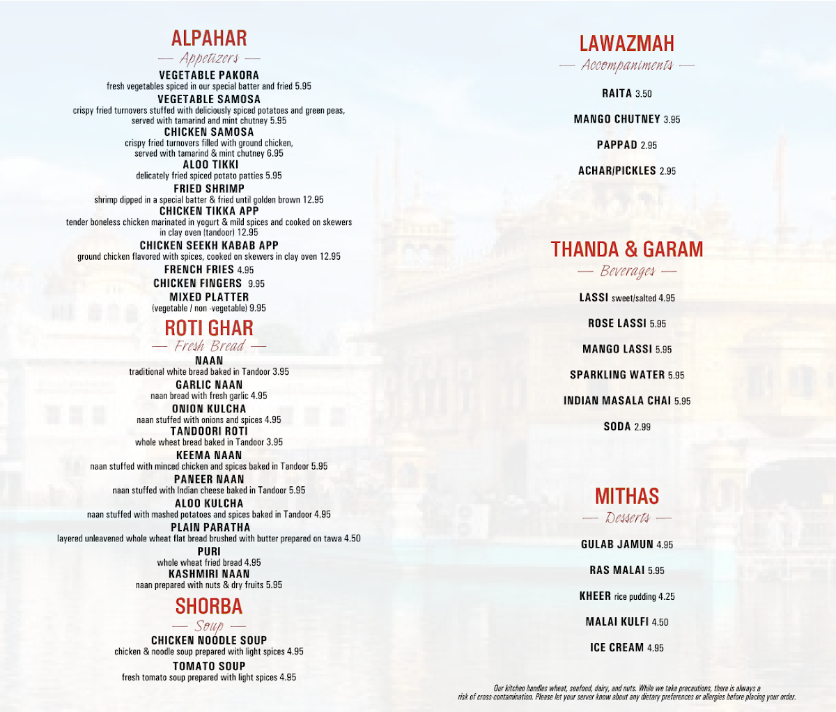 Accompany your meal with Raita, Mango Chutney, or Papadachar/Pickles for a burst of flavor. To quench your thirst, the restaurant offers a selection of beverages, including Lassi, Rose Lassi, and the refreshing Mango Lassi. For something warmer, try the classic Indian Masala Chai.