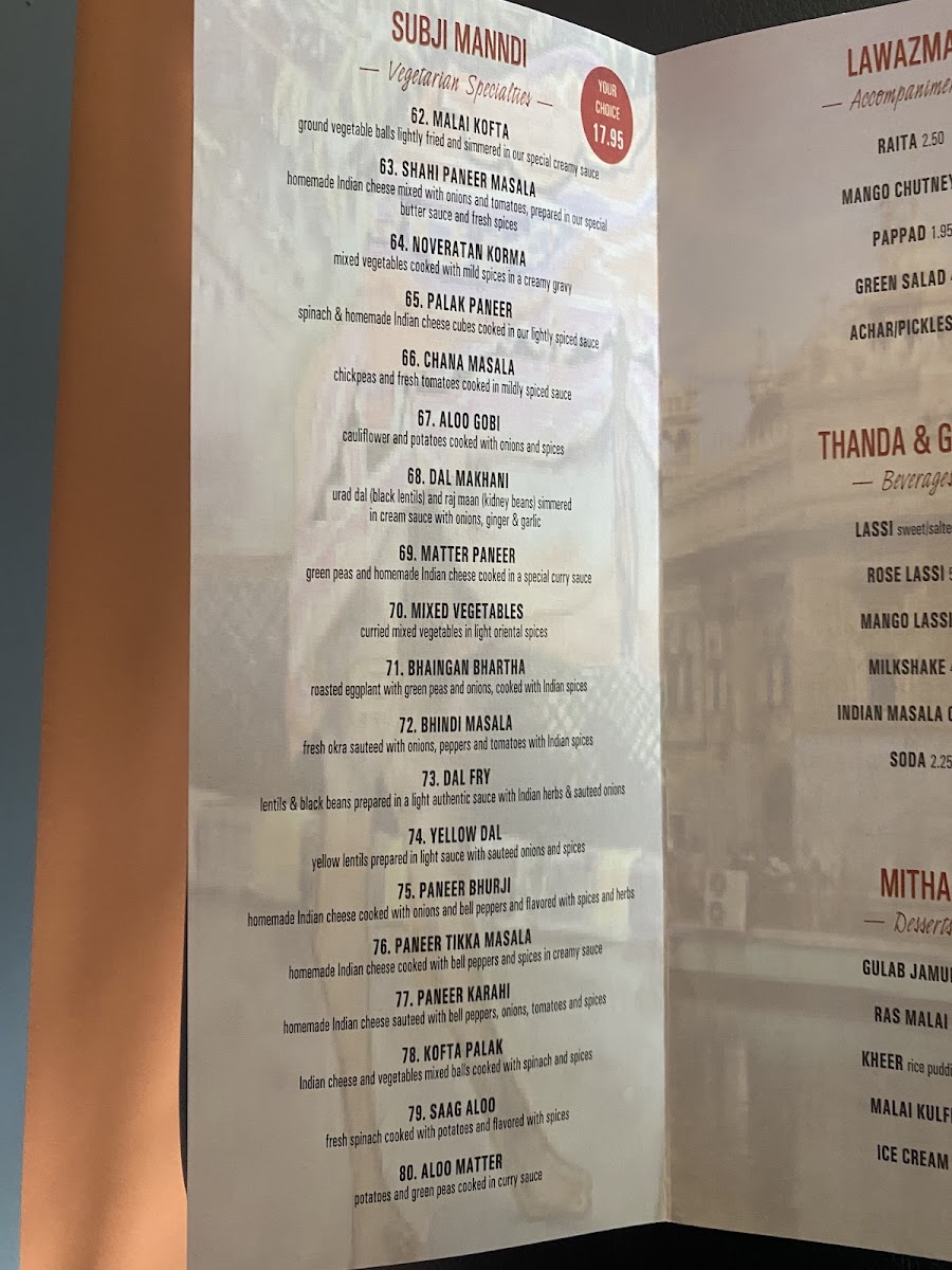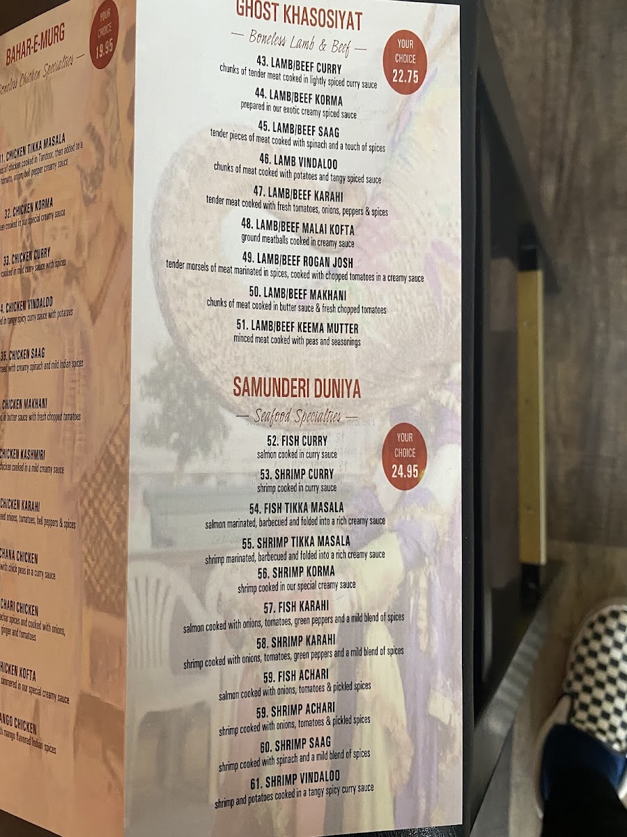 For those who prefer lamb or beef, the Lamb/BEEF Curry, Lamb/BEEF Korma, and Lamb/BEEF Saag offer rich, flavorful curries. The Lamb Vindaloo and Lamb Karahi deliver bolder, spicier flavors that are sure to satisfy. The Seafood Specialties showcase a range of fish and shrimp dishes, including Fish Curry, Shrimp Curry, and the popular Shrimp Tikka Masala.
